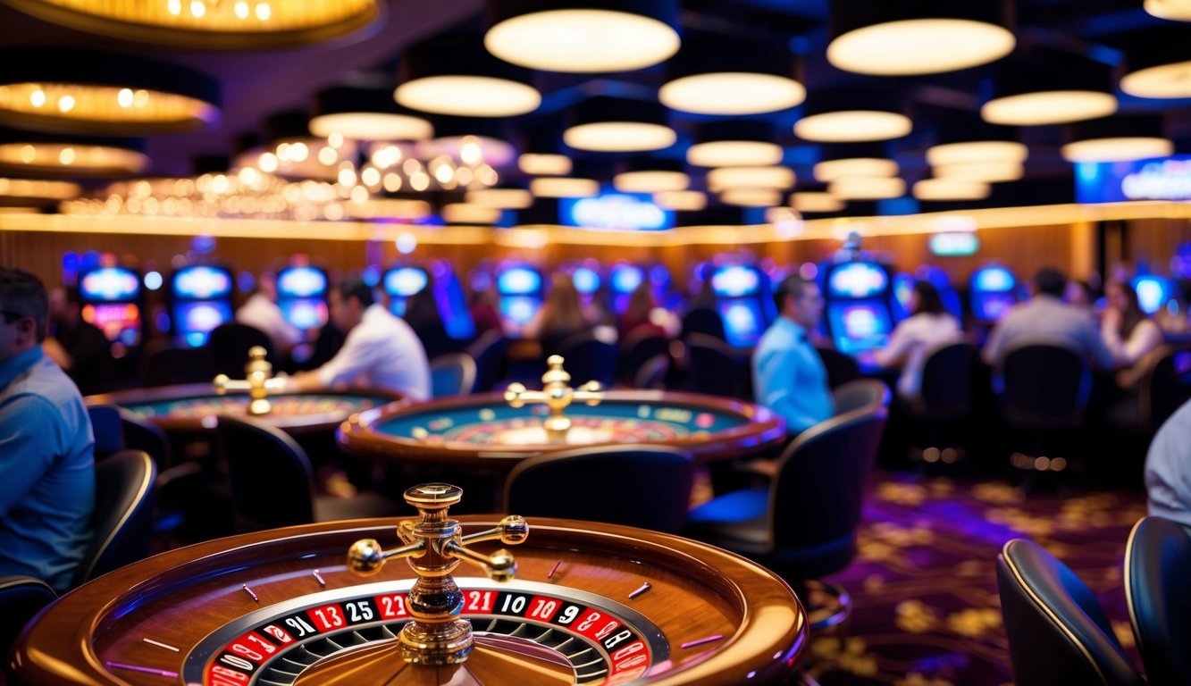 Sebuah kasino online yang cerah dan ramai dengan lampu berkedip, roda roulette yang berputar, dan kerumunan pemain virtual yang hidup